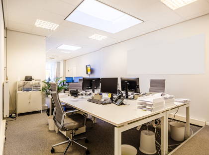 Via de centrale deur in de glasgevel heb je toegang tot de diepe open werkruimte. Deze krijgt veel licht via de grote ramen in de pui, de tl-armaturen in het plafond en twee lichtkoepels. Door de situering van de lichtkoepels achterin is het ook heel goed mogelijk om ook hier bijvoorbeeld een kantoor of open werkplekken te realiseren.