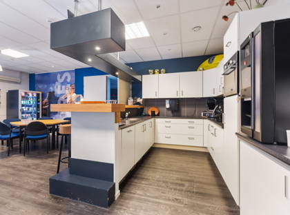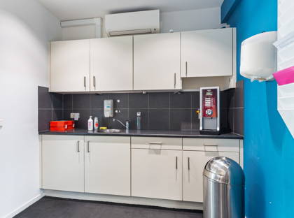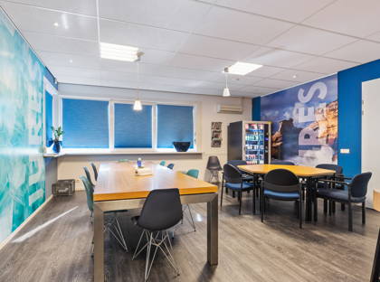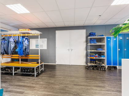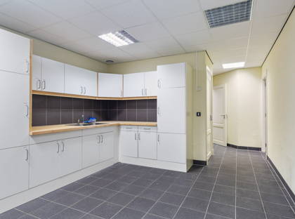 + Op de verdieping bevinden zich kantoren, een kantine met uitgebreid keukenblok in U-vorm, een kleedruimte, douche, toiletruimte en cv-ruimte.