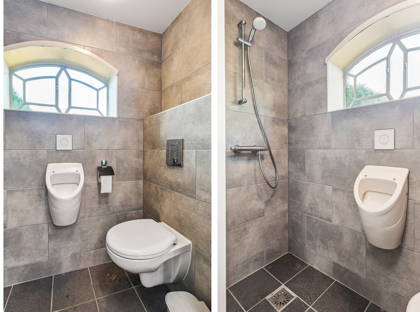 + Compacte geheel betegelde badkamer heeft een sfeervol halfrond venster, inloopdouche, wandtoilet en urinoir.