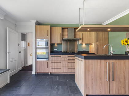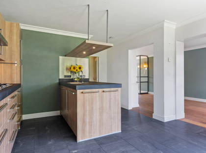 + Open boogportalen naar luxe leefkeuken met groot schiereiland en keukenblok. De keuken is uitgevoerd met een 5-pits gaskookplaat, anderhalve spoelbak, Quooker kraan, roestvrijstalen afzuigkap en spatwand, oven, combimagnetron, koelkast en vaatwasser. Bij een groot hoekvenster met deelramen is een mooie plaats voor de eettafel. Plavuizenvloer in de keuken gaat verder in de bijkeuken.