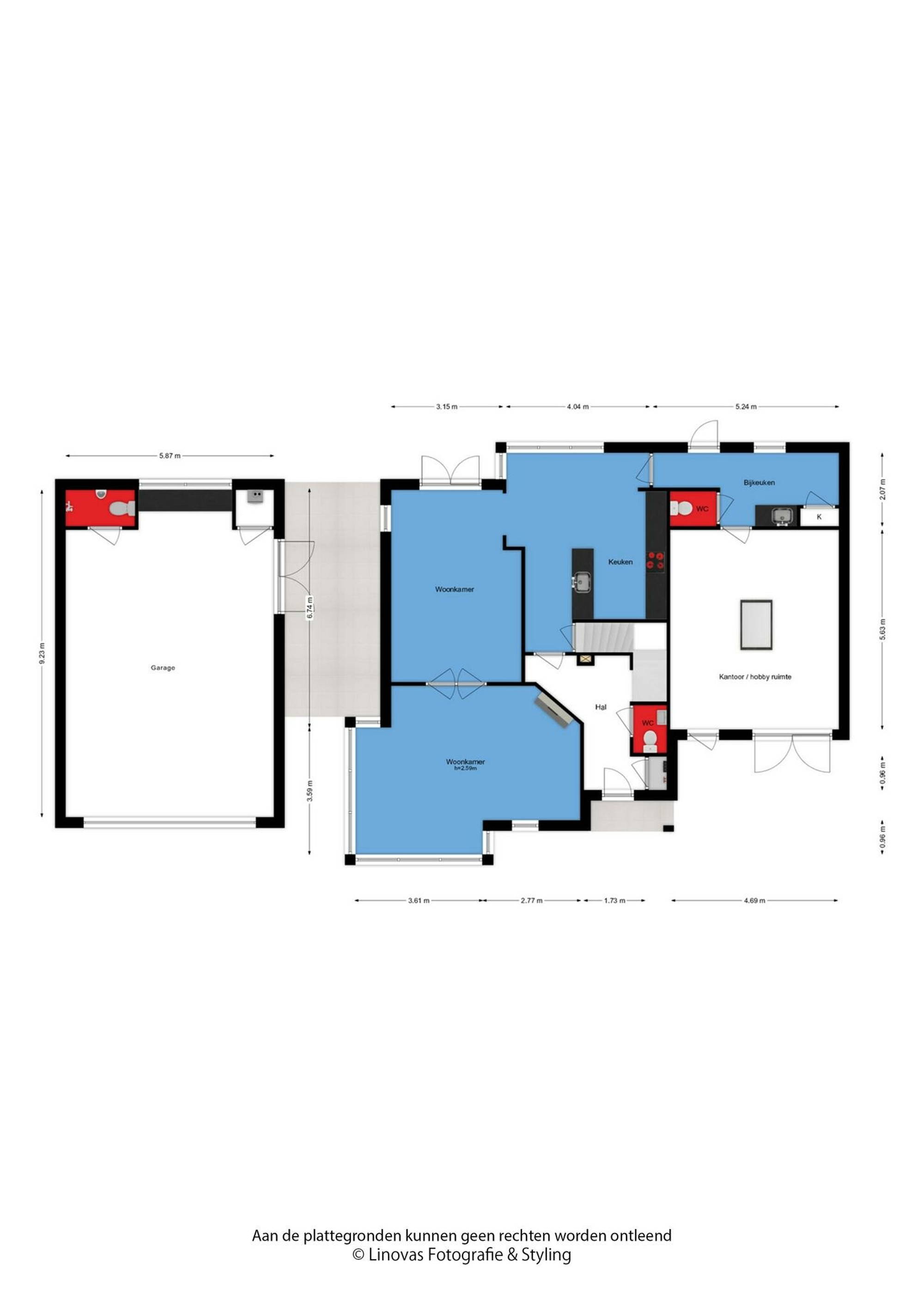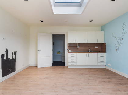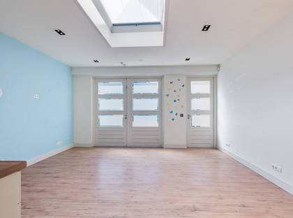 + Grote extra kamer -voormalige garage - heeft openslaande deuren en een aparte loopdeur aan de voorzijde. Aan de andere zijde is een keukenblok geplaatst. Plafond bevat spotverlichting en lichtkoepel.
