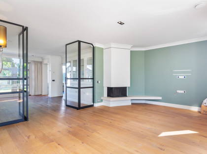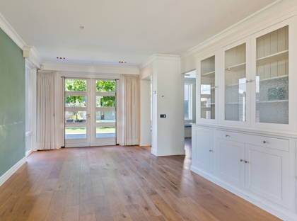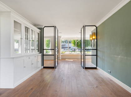 + Royale woonkamer heeft een zeer lichte uitstraling door groot hoekvenster met deelramen in erker aan de voorzijde en openslaande deuren aan de tuinzijde. De lichte tinten van stucwerkwanden, plafond met sierlijsten en spotverlichting brengen het licht verder de ruimte in. De woonkamer is voorzien van een open haard en een vaste kast. Er ligt een stijlvolle eikenhouten vloer met vloerverwarming. Fraaie stalen deuren verdelen de kamer in een zitgedeelte en eetkamer.