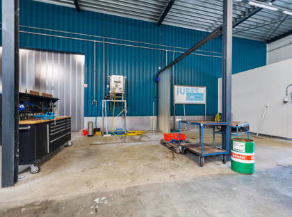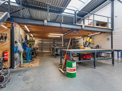 + Bedrijfshal is toegankelijk via overheaddeuren. Hier zijn veel opslag- en bergingsmogelijkheden. Verder zijn er een kantoor en een toiletruimte. Verwarming door gasheaters.