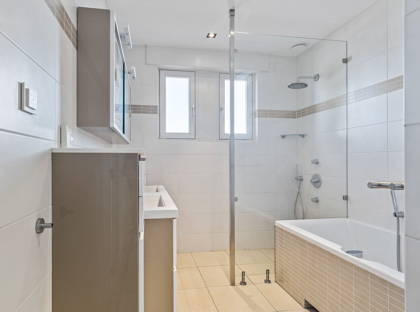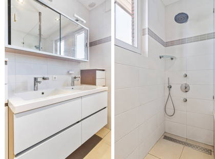 + Stijlvolle badkamer is geheel betegeld en voorzien van twee hoog geplaatste ramen, spotverlichting, ligbad, inloopdouche met regendouche, designradiator, wandtoilet en badkamermeubel met dubbele wastafel.