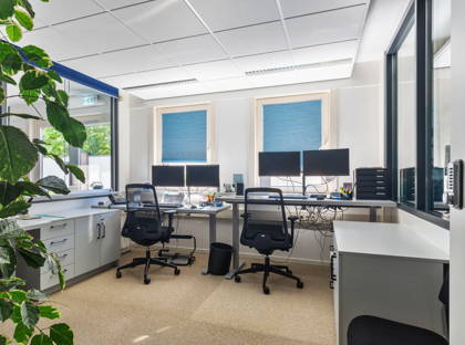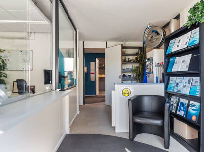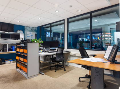 Naast de hal is een apart kantoorgedeelte van twee verdiepingen. Hierin bevinden zich een showroom, meerdere kantoren, een werkplaats, kantine met pantry, bergruimtes en een aparte toiletruimte. Het kantoorgedeelte heeft aparte eigen toegangsdeuren. Het gehele bedrijfsgebouw is uiteraard voorzien van de noodzakelijke moderne faciliteiten.