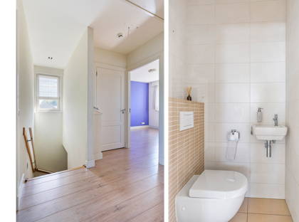+ Separate toiletruimte op overloop is geheel betegeld en bevat een wandtoilet en fonteintje.