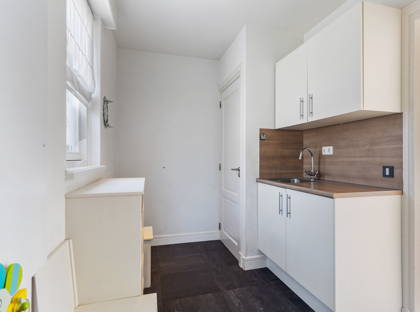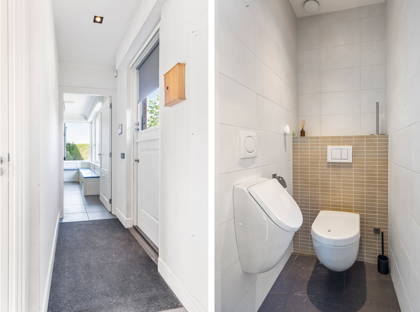 + In de bijkeuken is een compact keukenblok geplaatst. Hier bevindt zich een tweede geheel betegelde toiletruimte met wandtoilet en urinoir. De bijkeuken heeft een raam en een buitendeur. Tussendeur naar extra ruimte aan de voorzijde.