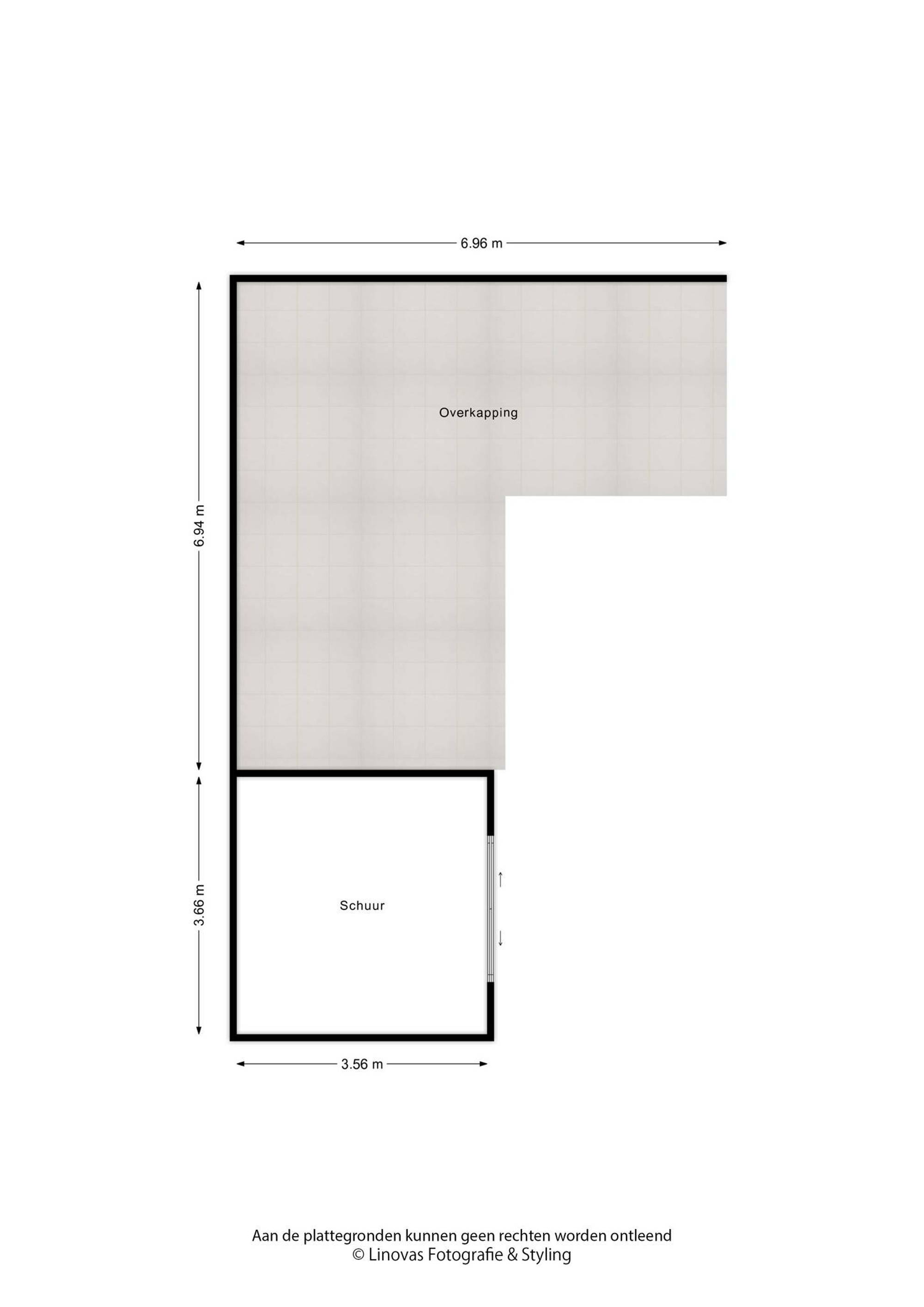 + Naast de woning bevindt zich een royaal stenen bijgebouw met een sectionaaldeur en een raam. Openslaande deuren aan de zijkant komen uit onder een overkapping bij de woning.