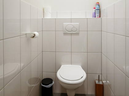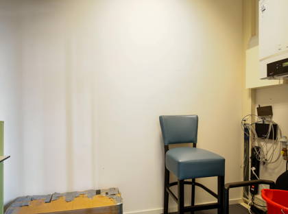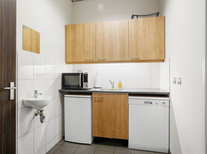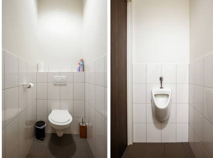 + Vanuit bedrijfsruimte is er een doorgang naar een eigen pantry met keukenblok en apart fonteintje. Hiernaast is een toiletruimte met dames- en herentoilet.