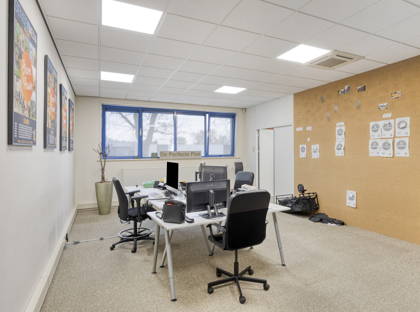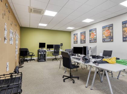 + Voorzien van airco, mechanische ventilatie, glasvezel en elektrische screens. Toegangsdeuren aan voorzijde hebben rolluiken.