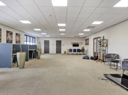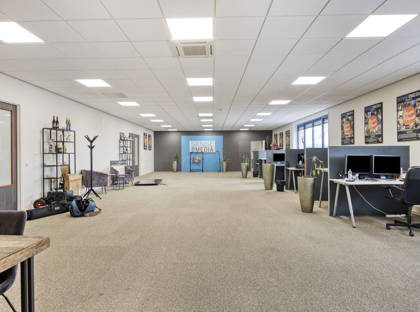 De kantoorruimte kenmerkt zich door een functionele en flexibele opzet. De open werkruimte kan desgewenst eenvoudig worden ingedeeld met (mobiele) scheidingswanden, waardoor zowel kantoortuinen als separate werk- of vergaderruimtes gerealiseerd kunnen worden. Grote raampartijen en hoge gevelvensters zorgen voor een uitstekende daglichttoetreding, wat bijdraagt aan een prettige werksfeer.
